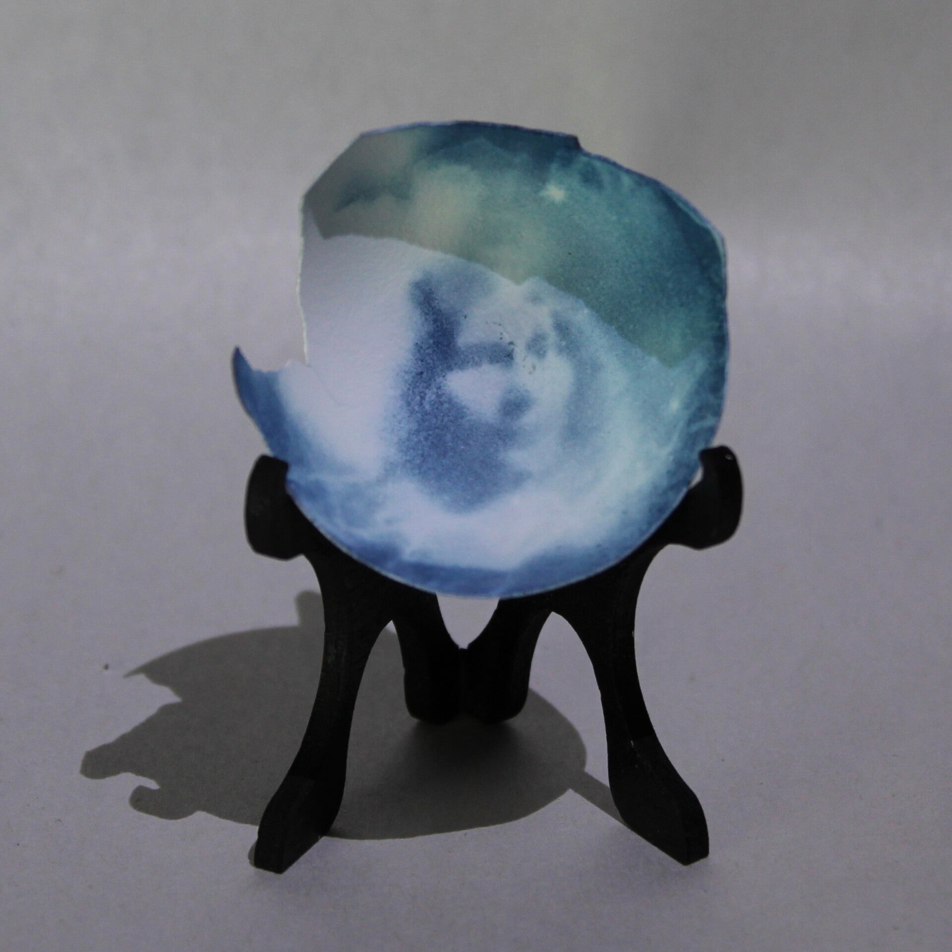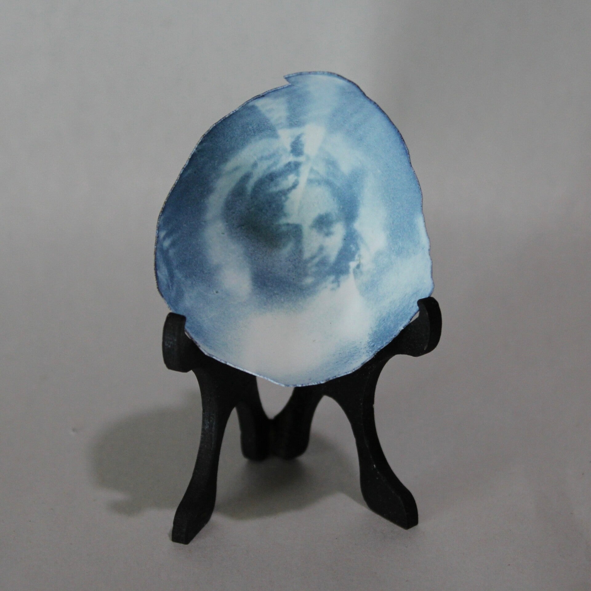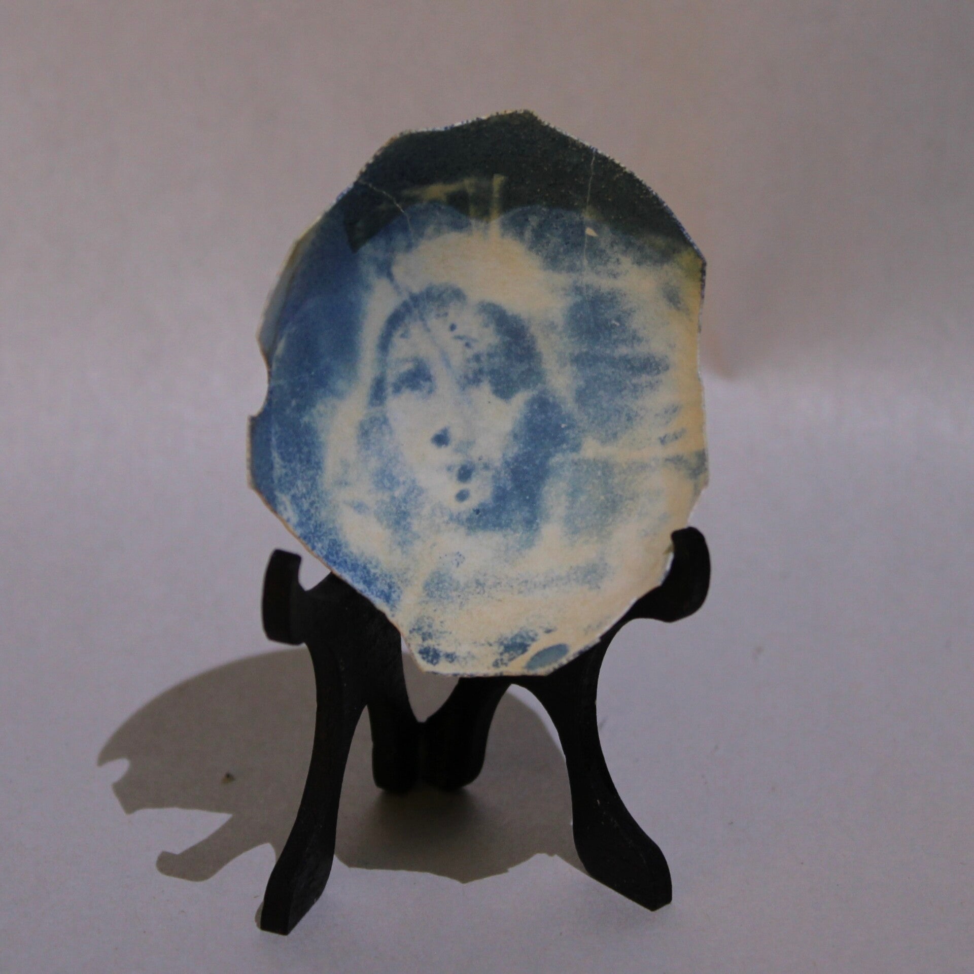 Cyanotype images printed on fragile eggshell fragments, transforming discarded materials into small photographic objects.